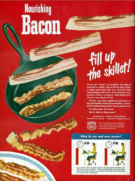 Et la solution que trouve Edward Bernays est alors plutôt brillante : pourquoi essayer d’augmenter les quantités de viandes durant la journée, si on peut convaincre l’opinion publique que le repas qui est connu comme le plus important de la journée depuis quelques années, qui est le petit-déjeuner, doit être en réalité le plus riche en protéine et en lipide ? Et pourquoi, par la même occasion, ne pas insinuer que la parfaite incarnation de ce repas pour un américain est le « Egg & Bacon« , en complément de ses pancakes.